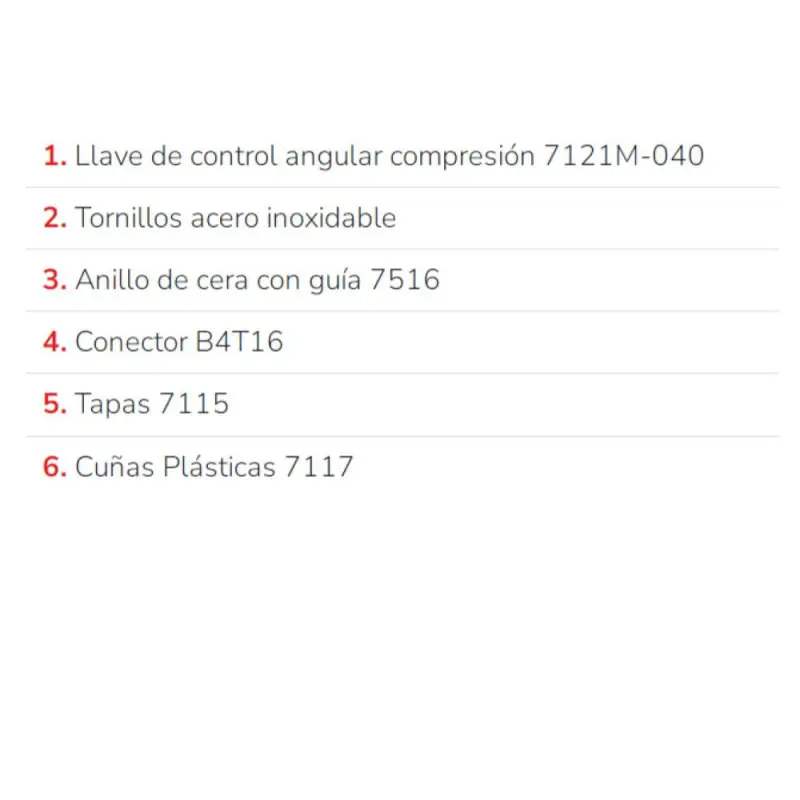 - Llave de control compresión, conector de acero inoxidable, pernos de acero inoxidable, anclajes de plástico, cuñas para nivelación perfecta y tapas oculta pernos.