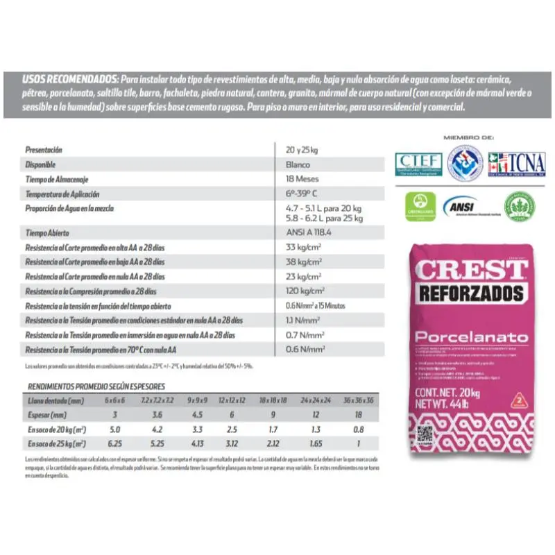 • Rendimiento promedio de 5 m2 por saco de 20 kg con espesor de 3 mm.
