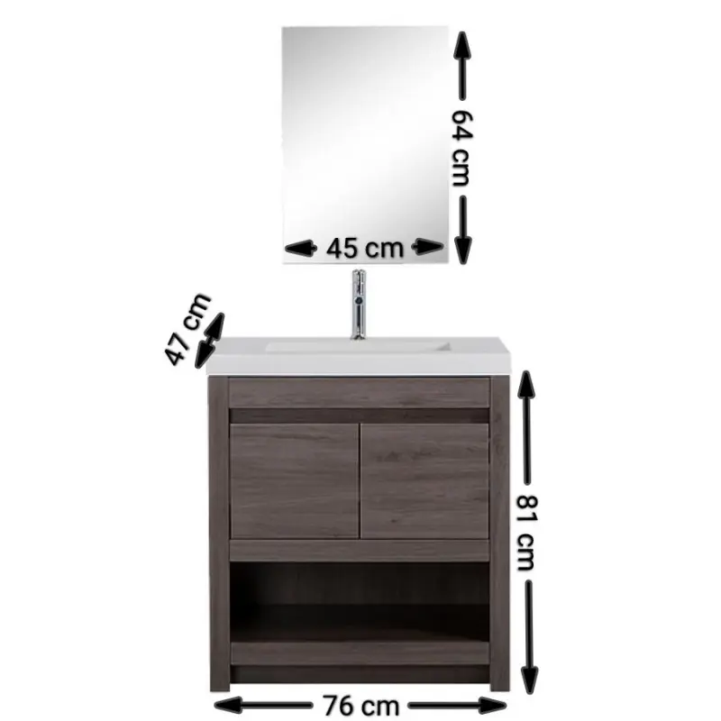 Hola buenas tardes, le comparto las medidas :Espejo: Luna de 3 mm de espesor, Dimensiones de gabinete: 76.2x47x81.6 cm, Peso de gabinete: 28.8 kg, Dimensiones de lavabo: 77.5x47.6x15.9 cm, Peso de lavabo: 20.23 kg, Dimensiones de espejo: 45.4x1.9x64.1 cm y Peso de espejo: 5 kg, incluye tocador, lavabo y espejo contamos con entrega a domicilio de 2 a 4 días hábiles, en el area metropolitana y cdmx el flete es sin costo, buen día.