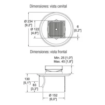 • Características: Coladera de una boca, desagüe de contorno cuadrado para inserto cerámico o mármol, cuenta con un plato de doble drenaje, una ranura de desalojo perimetral de 6 mm, el espesor máximo de inserto es 10 mm.