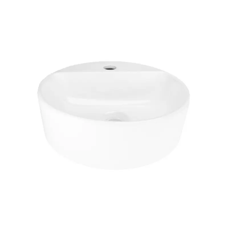 - Lavabo redondo de sobreponer con una perforación, barreno de Ø33 mm para instalación de monomando y desagüe de Ø44 mm.