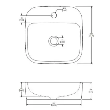 •  Lavabo de sobreponer con una perforación, superficies planas, barreno de Ø33 mm para instalación de monomando y desagüe de Ø44 mm.